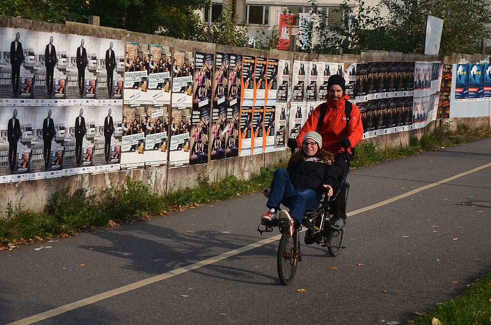 Nous traversâmes l’Allemagne au rythme d’une valse en battant notre mesure en trois temps passionnés qui nous conduisirent aux portes de la Hollande. Premier temps de notre traversée: plus fort, plus déplacé et plus rythmé que les deux suivants, (pas le temps de trainer): L’est de l’Allemagne! De Swinoujjscie à Hamburg, notre roulâmes 340 km en quatre jours. Il n’y eut pas une seule goutte de pluie, pas un jour sans que nous découvrîmes un petit joyau architectural et pas une soirée sans que nous soyons accueillis et adoptés par un couple de personnes âgées qui nous dorlotèrent comme leurs propre petits enfants. Ce court séjour nous prouva combien l’Allemagne de l’est, (souvent délaissée au profit des autres régions), mérite le temps d’un détour. Si nous devions vous conseiller ne serait-ce qu’une étape à ne pas manquer, nous vous donnerions sans hésiter le nom de la ville de Ratzeburg qui, située entre quatre lacs et capitale du duché de Lauenbourg, rivalise selon nous avec les charmes de la Bavière. Deuxième temps de notre traversée: plus balancé à gauche de la carte de l’Europe, plus lent que le premier; on souffle, on respire, on s’abandonne: Hamburg! A Hamburg nous retrouvâmes Amélie, une des sœurs d’Alexandre, qui n’avait pas non plus lésiné sur les kilomètres (en bus de nuit) pour nous rejoindre. C’est au rythme de chaleureuses retrouvailles que nous visitâmes tous les trois Hamburg. Sur les eaux de l’Elbe, le long des vieux entrepôts en brique réhabilités et devant l’incessante activité du port, nous eûmes l’envie de ranger le tandem et de vivre en Allemagne. Troisième temps de notre traversée: “nous nous offrons encore le temps. Il y a Brême qui bat la mesure, Brême qui mesure notre émoi, Brême qui laisse éclater notre joie...” A Brême nous rejoignîmes Pierre et Camille, des amis de Bangalore maintenant installés en Allemagne. Au “flohmarkt”, au “Biergarten” et dans les ruelles pavées de Brême nous fîmes resurgir les souvenirs de l’Inde. Nous marchions en Allemagne, mais nous avions tous les quatre le cœur à Bangalore. Bien que nous eussions déjà pédalé plus de 12 000 km, notre lieu de départ ne nous parut jamais si proche. 150 km de vélo et deux nuits sous tente en forêt nous firent quitter l’Allemagne et rentrer aux Pays-Bas. L’ Allemagne fut pour nous le temps d’une valse, bien belle, bien courte, bien trop vite achevée...